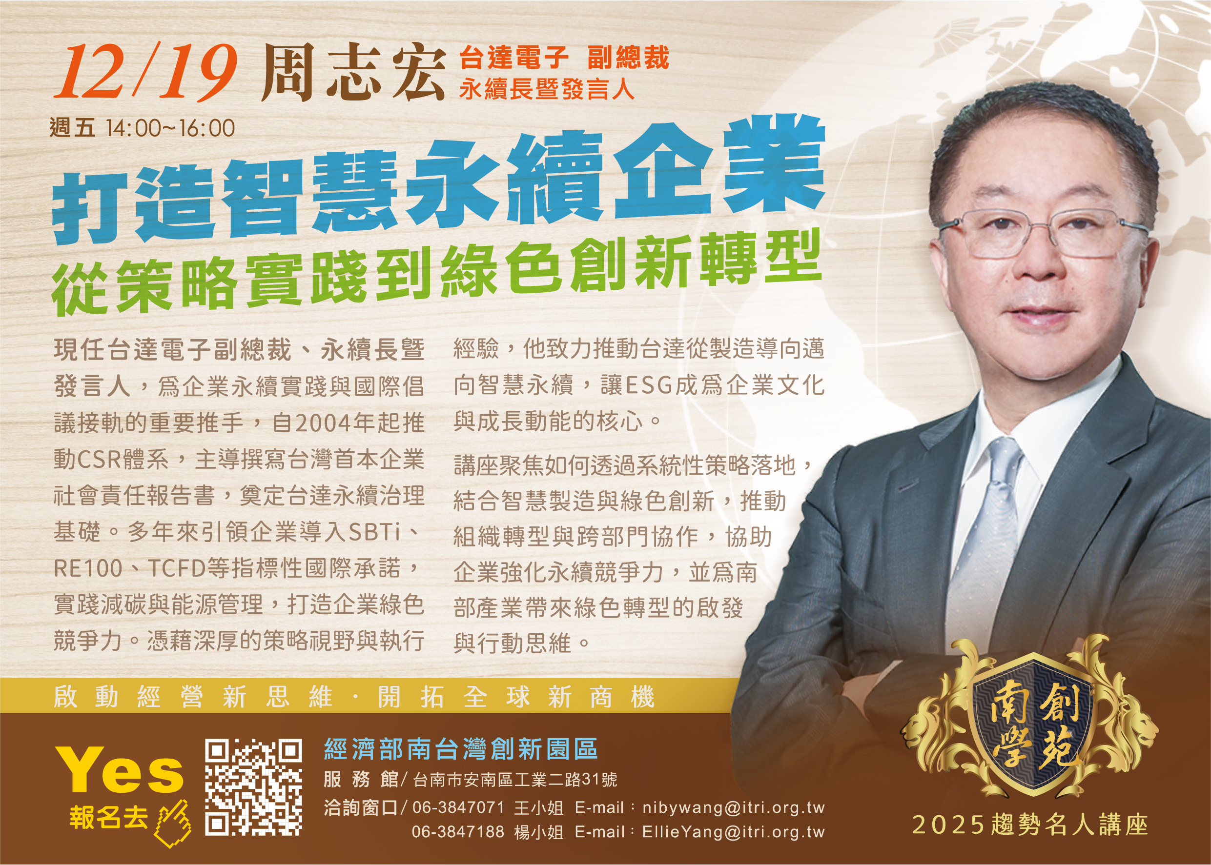 | 講座地點: | 經濟部南台灣創新園區/台南市安南區工業二路31號 | |