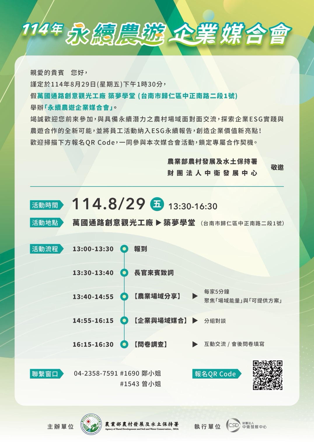 誠摯邀請您參加農村水保署8/29(五)【永續農遊企業媒合會(台南場)】,與來自南部的特色農村場域、休閒農場、農業社區現場交流,探索永續旅遊、CSR活動與員工福祉的新合作夥伴!