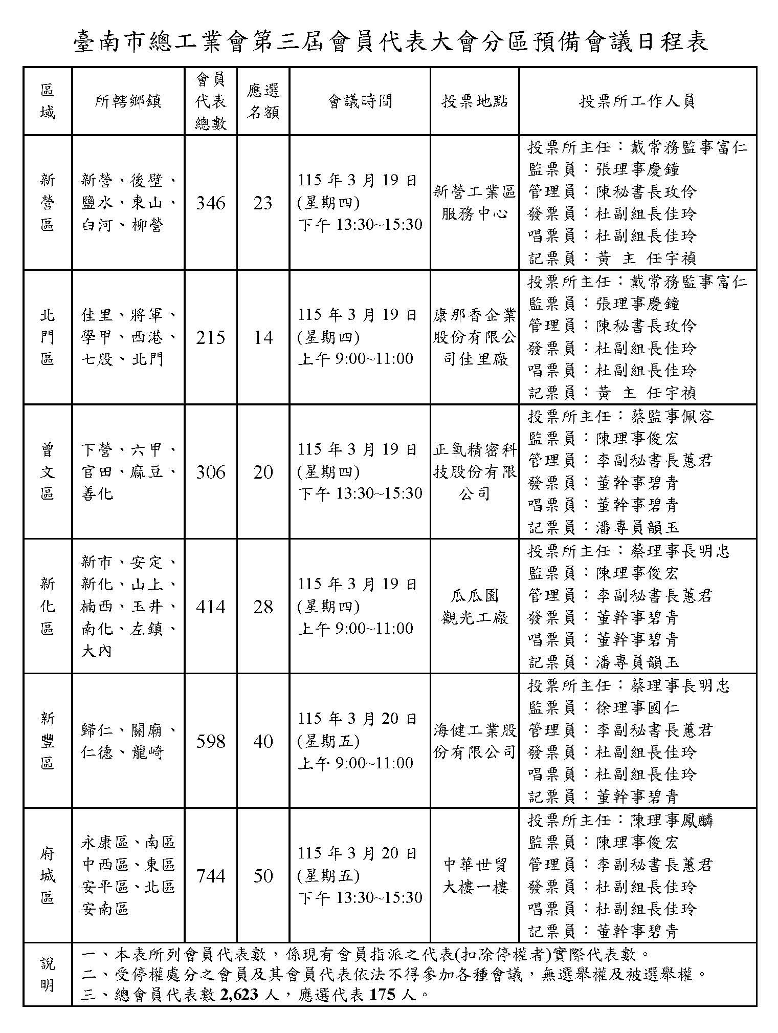臺南市總工業會第三屆會員代表大會分區召開預備會議日程表